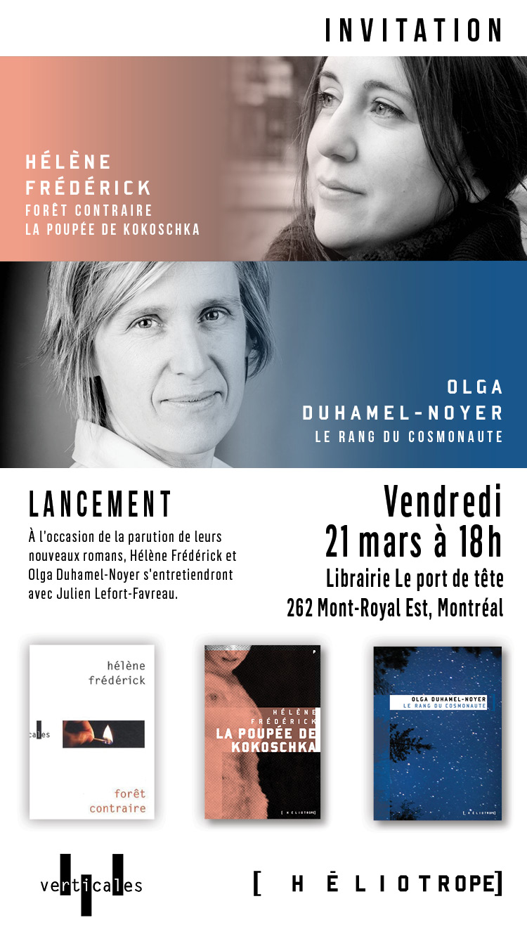 Parenthèse dans la résidence « insoumission et littératures » : le jeudi 6 mars, à la Librairie du Québec, je discuterai de mes deux livres en compagnie d’Isabelle Gagnon. La comédienne Geneviève Boivin lira des extraits de Forêt contraire. Un pot de l’amitié suivra! Je serais très heureuse de vous y retrouver.